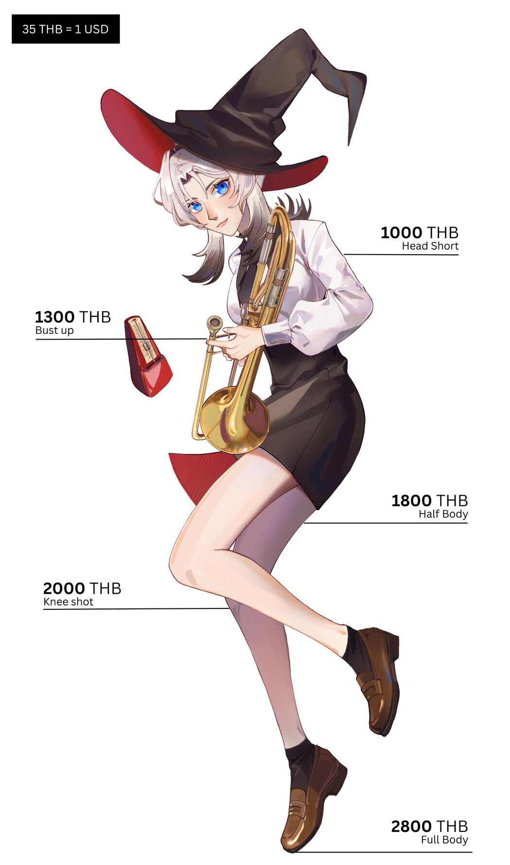 -ราคานี้ใช้สำหรับงานส่วนตัวและเป็นเพียงราคาเริ่มต้นเท่านั้น ราคาจะเพิ่มขึ้นตามรายละเอียด-เชิงพาณิชย์ +70% จากราคางานส่วนตัว งานเชิงพาณิชย์-โอนมัดจำก่อนเริ่มงาน 50% (ภายในระยะเวลา 3 วัน) หรืออีกกรณีที่คิวอยู่ไกล สามารถโอนเมื่อใกล้ถึงคิวแล้วก็ได้ค่ะ ทางเราจะแจ้งไปก่อนเริ่มงานอีกที-แก้ไขในขั้นตอนร่างภาพได้ 3 ครั้ง ครั้งต่อไป +50 THB ต่อครั้ง (ไม่ใช่การเปลี่ยนบรีฟทั้งภาพ แต่เป็นการแก้ไขเล็กน้อยจากบรีฟ เช่น สีหน้า ดีเทล มือ ตำแหน่ง ฯลฯ)-ระยะเวลาในการทำงานจะอยู่ที่ 1-3 สัปดาห์ ต่อ 1 คิว คิวต่อไปก็จะรันคิวไปเรื่อย ๆ หากมีภารกิจหรือเหตุสุดวิสัยเราจะรีบแจ้งไป แต่จะไม่ให้เกินเดธไลน์แน่นอนค่ะ-เรามีสิทธิ์ที่จะปฎิเสธงานที่ไม่ถนัด ยากเกินความสามารถ และงานที่เราคิดว่าทำไม่ทันเดธไลน์นะคะ-ค่ากระดาษ A4 ขนาด 210 x 297 มม. ความละเอียด 300 dpi หรือขนาดที่ลูกค้าต้องการ-งานที่เสร็จแล้วจะถูกโพสต์ไปที่ Twitter และช่องทางอื่น ๆ หากไม่ต้องการให้ลงสามารถบอกก่อนได้ค่ะ